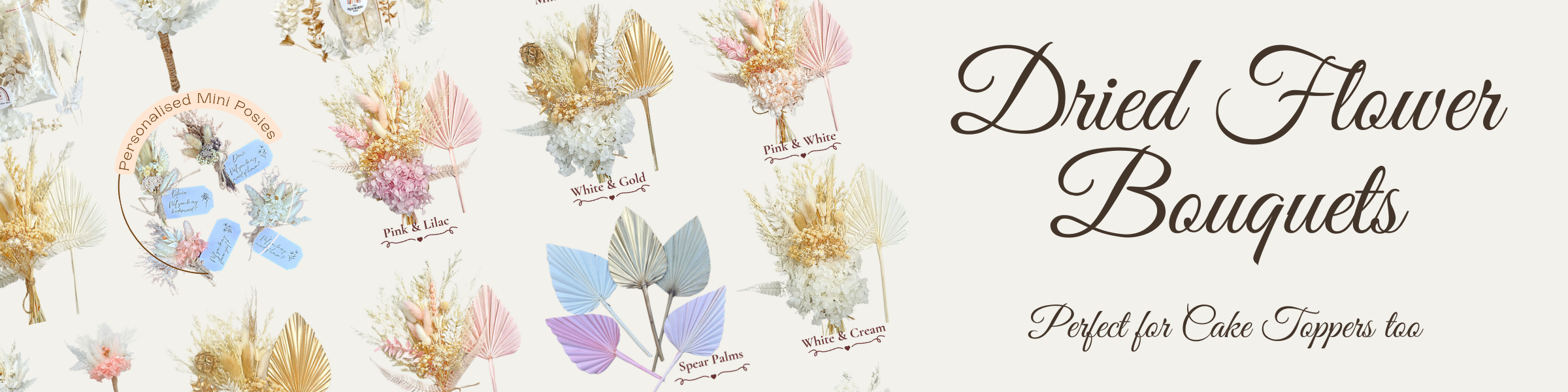 Beige and White Mini posy for wedding favours, cake toppers and gift hampers. Perfect Mini Dried Flower Bouquet for any occasion | Mini Cake & Gift Topper